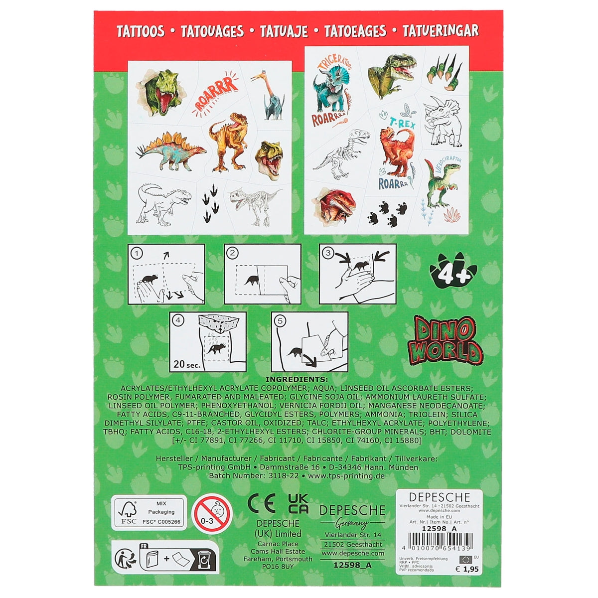 A sheet of temporary dinosaur tattoos featuring colourful designs suitable for parties, crafts, and imaginative play. Suitable for ages 3+.
