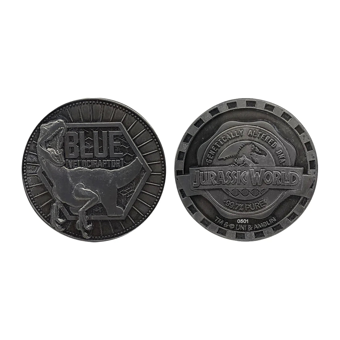 A collectible metal coin featuring Blue the Velociraptor from Jurassic World, presented in display packaging. Suitable for ages 14+.