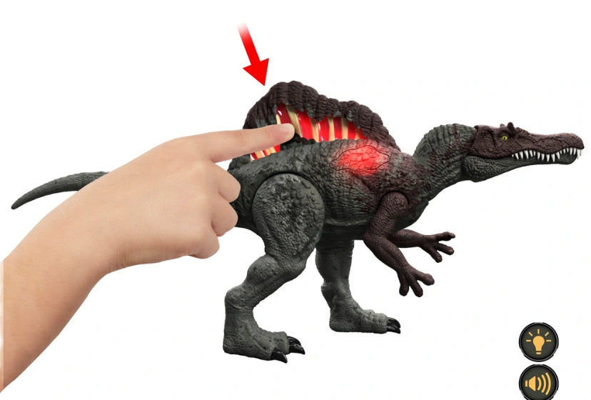This Jurassic World Slash Attackin' Spinosaurus figure showcases an iconic species at more than 53cm long. It doesn't just look fierce; it has multiple battle and damage features and a swamp-coloured deco. Pull either of its arms up to activate a side-rotating head chomp and roar! Push the damage panel on the back sail once to reveal the damage area, lights and sounds.