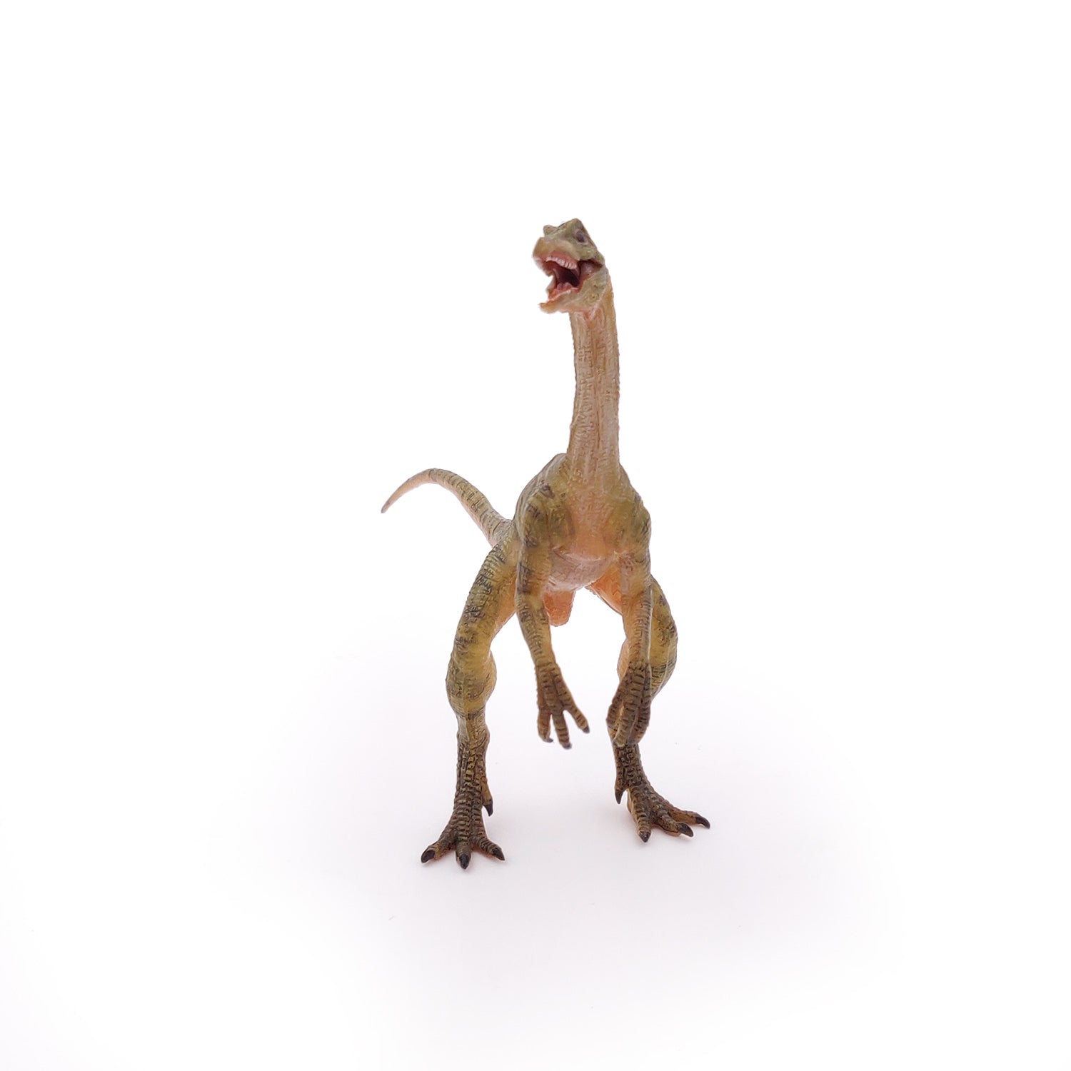 The compsognathus, from the Compsognathidae family, is a small carnivorous high about a meter who lived 155 to 150 million years ago. This biped had long hind legs as well as an even longer tail essential to his balance when he was moving. His long, thin hind legs allowed him to reach a maximum speed of 64 km/h. His name, which means “delicate jaw,” comes from his narrow, long head ending in a slender snout.